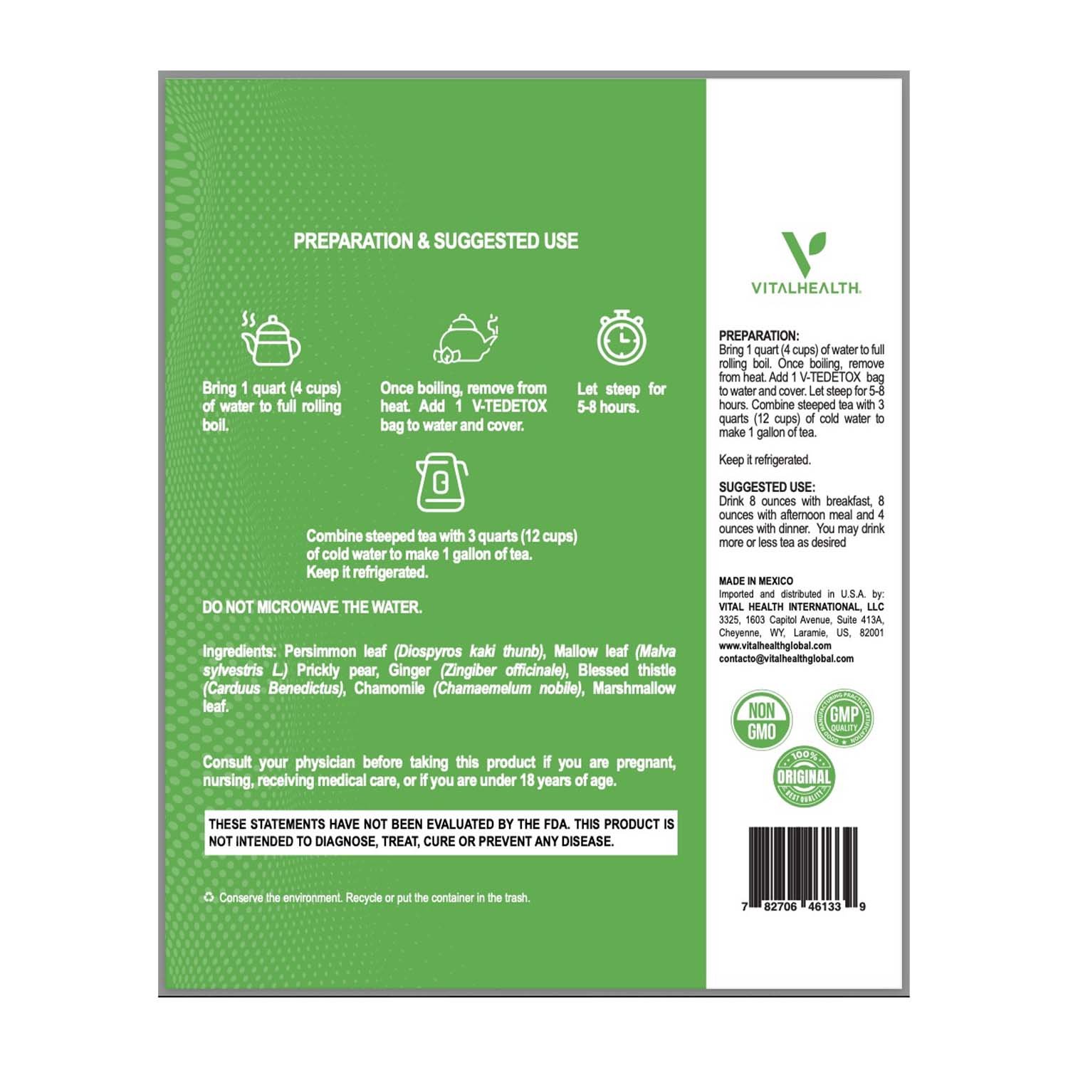 ¿Buscas una versión tuya más saludable y esbelta? ¡Comienza ese cambio con V-TEDETOX! Elaborado con una mezcla herbal de ingredientes naturales, V-TEDETOX ayudará a tu cuerpo a eliminar las toxinas que se han acumulado a través de los años en él, incluyendo la zona intestinal donde se origina el 80% de tu sistema inmune. ¡Disfruta de su delicioso sabor mientras obtienes todos sus beneficios!